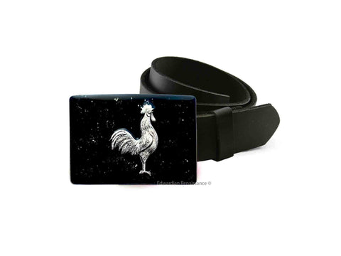 Antique Silver Rooster Belt Buckle: Black Ink Swirl Enamel, Vintage Style