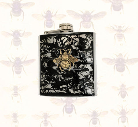 Bee Hip Flask Inlaid in Hand Painted Enamel Black Ink Swirl Design Neo Victorian Inspired Custom Colors and Personalized Options Available