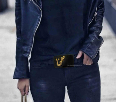 Hand Painted Mermaid Belt Buckle: Black Ink Swirl Enamel, Nautical Siren