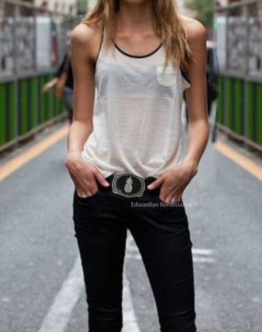 Pineapple Belt Buckle: Hand-Painted Enamel, Antique Silver Finish