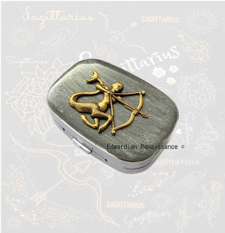 Sagittarius Pill Box Inlaid in Hand Painted Silver Enamel Neo Victorian Archer with Personalized and Color Options Available