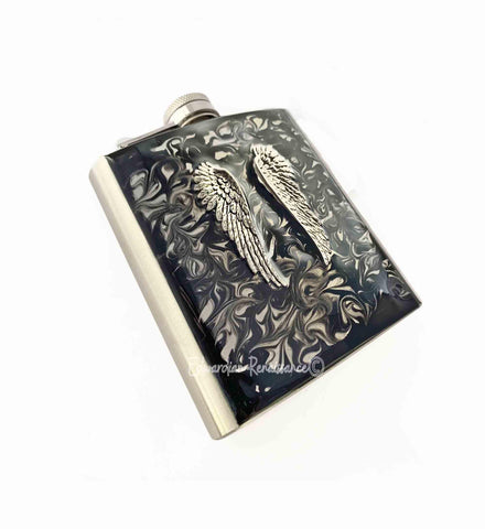 Antique Silver Wings Flask: Hand-Painted Black Swirl Enamel, Personalized