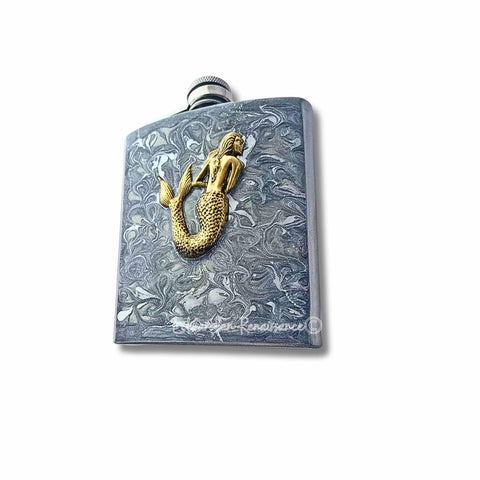 Antique Gold Mermaid Flask: Hand Painted Gold Swirl Enamel, Personalized