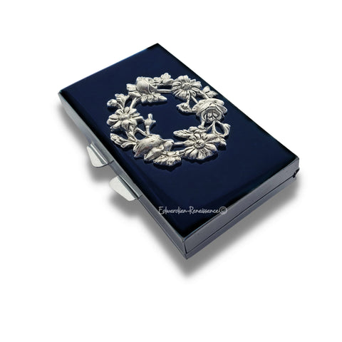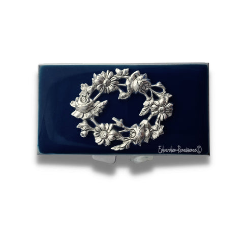 Flowers Pill Box Inlaid in Hand Painted Glossy Black Enamel Art Nouveau Floral Wreath Weekly Pill Case with Personalized and Color Options