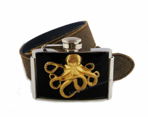 Octopus Flask Belt Buckle Inlaid in Hand Painted Metallic Bronze Enamel Kraken Inspired 3 oz. Flask Personalized and Color Options