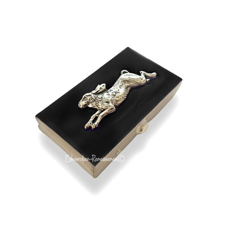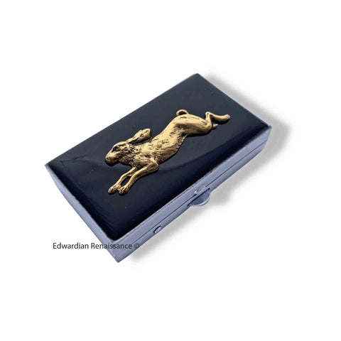 Antique Silver Hare Pill Box Inlaid in Hand Painted Black Enamel Neo Victorian Alice in Wonderland Inspired Personalized and Color Options