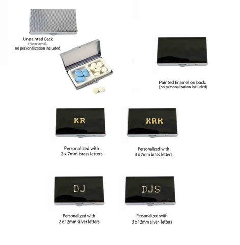 *Inlaid Letters in the enamel- Enter letters you'd like (2 or 3 letters based on your choice to be placed on the back of the pill box).